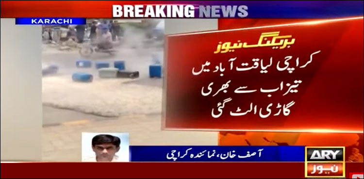 اے آر وائی نیوز کے مطابق کراچی کے علاقے لیاقت آباد نمبر 4 کے قریب تیزاب سے بھری گاڑی الٹ گئی جس کے باعث تیزاب سڑک پر پھیل گیا اور ہر طرف دھواں ہوگیا۔