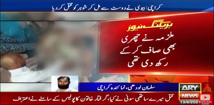 نمائندہ اے آر وائی نیوز کے مطابق کراچی کے علاقے کورنگی کے علاقے محمد علی کالونی 51 بی کی رہائشی خاتون نے اپنے آشنا کے ساتھ مل کر شوہر محمد شاہد کو چھری کے وار سے قتل کیا۔