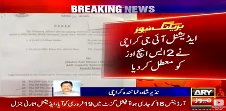 ایڈیشنل آئی جی کراچی نے رات گئے ایکشن لیا اور ایس ایچ او مبینہ ٹاون فیض الحسن اور ایس ایچ او الفلاح معطل کیا، غلام نبی میمن نے بتایا کہ دونوں ایس ایچ اوزکےخلاف خفیہ انکوائری جاری تھی، رپورٹ کے مطابق علاقے میں منظم جرائم جاری تھے جس پر ان دونوں افسران کو معطل کیا گیا، دونوں اب بلیک کمپنی کے لیے کام کریں گے۔
