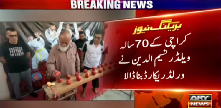 اے آر وائی نیوز کے مطابق کراچی کے ستر سالہ بزرگ ویلڈر نسیم الدین نے مٹھی میں سیب رکھ کر توڑنے کے عالمی مقابلے میں انگلینڈ کو شکست دی۔