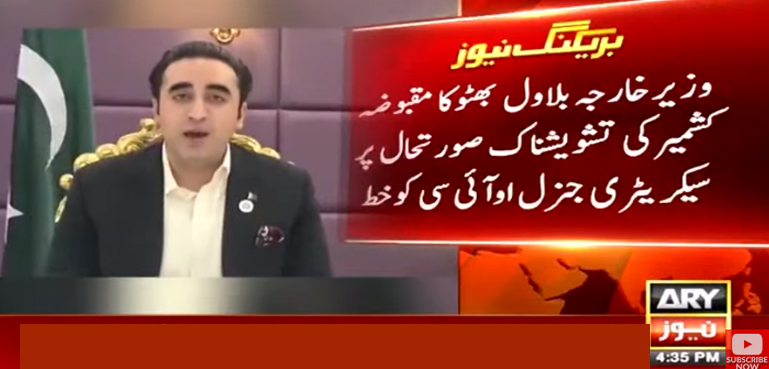 وزیر خارجہ بلاول بھٹو نے سیکریٹری جنرل او آئی سی کو خط لکھ کر انہیں مقبوضہ جموں وکشمیر کی سنگین صورتحال سے آگاہ کیا ہے۔