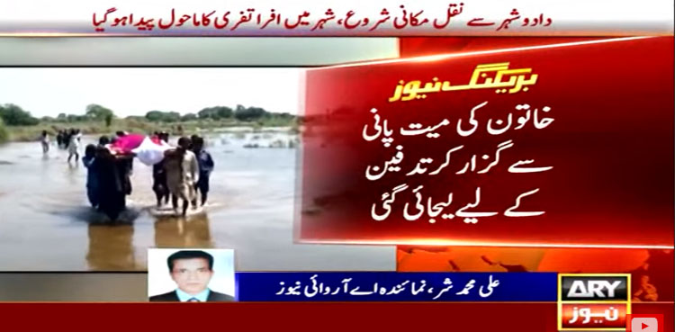 اے آر وائی نیوز کے مطابق خیرپور کے گاؤں اکری میں سیلاب متاثرہ حاملہ خاتون کو گاؤں سے شہر تک پانی ہونے کے باعث بروقت اسپتال نہ پہنایا جاسکا جس کے نتیجے میں وہ بچے سمیت جاں بحق ہوگئی۔