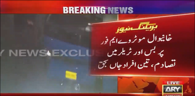 لاہور: صوبہ پنجاب کے شہر خانیوال میں بس اور ٹریلر کے درمیان تصادم کے نتیجے میں 3 افراد جاں بحق اور 11 افراد زخمی ہوگئے
