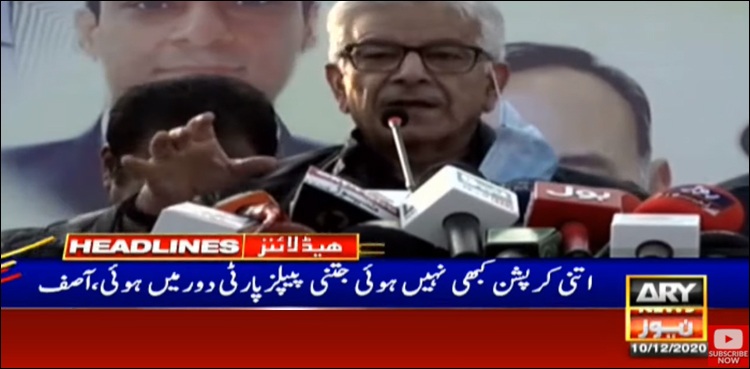 خواجہ آصف کا کہنا تھا کہ ’اتنی کرپشن کبھی نہیں ہوئی جتنی پیپلزپارٹی کے دور میں ہوئی ہے، ملک کی خرابی کی ذمہ دار پی پی ہے‘۔ بعد ازاں ایک کارکن نے لیگی رہنما کو توجہ دلائی تو خواجہ آصف نے اپنے بیان کو درست کرتے ہوئے بولا کہ پیپلزپارٹی نہیں بلکہ پی ٹی آٗی کے دور میں ہوئی۔