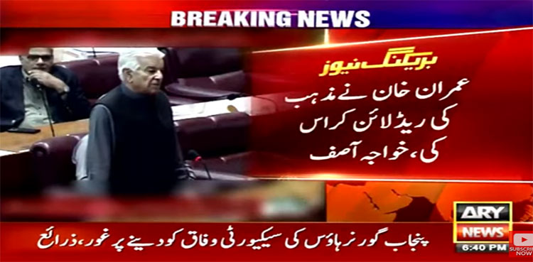 تفصیلات کے مطابق قومی اسمبلی اجلاس میں اظہار خیال کرتے ہوئے وزیر دفاع خواجہ آصف نے کہا کہ عمران خان کا حملہ مذہبی جنونیت کا معاملہ ہے مگر اسے سیاسی مقاصد کیلئے استعمال کیا جارہا ہے۔