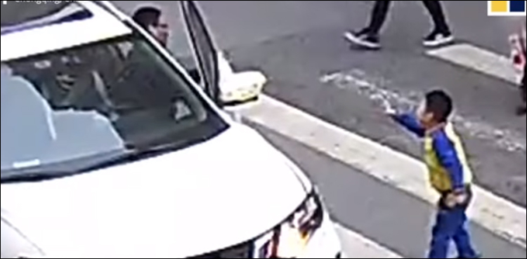 ماں کو گاڑی کی ٹکر لگنا بیٹے سے برداشت نہ ہوا پہلے 6 سالہ بچے نے اپنی ماں کو چیک کیا، ماں کی خیریت جانے کے بعد بچے نے ٹکر مارنے کی گاڑی کے بمپر پر ککیں مارنا شروع کردی اور گاڑی کے سامنے کھڑے ہوکر ڈرائیور کو بھاگنے سے روکا۔