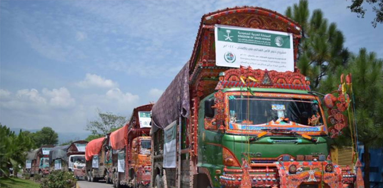 تفصیلات کے مطابق سیلاب سے متاثرہ افراد کیلئے غذائی ضروریات کو پورا کرنے کے لیے کنگ سلمان ریلیف سینٹر سے فوڈ پیکیج کا تیسرا امدادی قافلہ روانہ کیا گیا ہے، ہنگامی امداد کے تحت 950 ٹن ضروری اشیائے خوردونوش کے 100 ٹرک روانہ کردیے۔