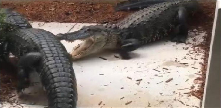 واشنگٹن: امریکی ریاست فلوریڈا میں دو خوفناک مگرمچھ لڑتے ہوئے ایک گھر کے دروازے تک پہنچ گئے، مگرمچھوں کی لڑائی نے مکینوں کی چیخیں نکال دیں۔