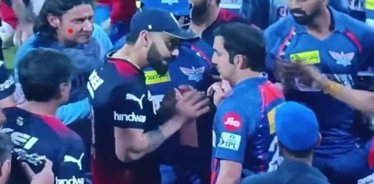 میچ ختم ہونے کے بعد لکھنو سپر جائنٹس کے بیٹر کائل میئرز کوہلی سے گفتگو کررہے تھے کہ گمبھیر نے اچانک انہیں پیچھے کھینچا اور کوہلی سے بات کرنے سے روک دیا۔