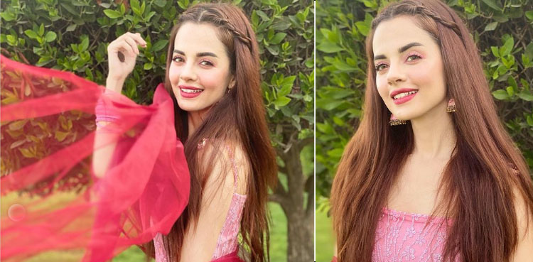 کومل میر نے تصاویر میں گلابی لباس اور سرخ دوپٹہ پہن رکھا ہے۔
