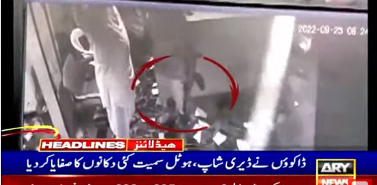 چہرہ ڈھانپے 5 کلاشنکوف بردار ڈاکوؤں نے ڈیری شاپ اور ہوٹل سمیت کئی دکانوں میں لوٹ مار کی۔