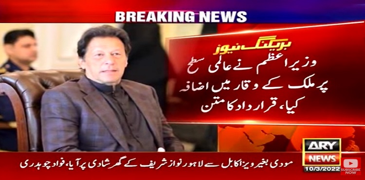 قرارداد کے متن میں کہا گیا کہ وزیراعظم نے عالمی سطح پر ملک کے وقار میں اضافہ کیا یہ ایوان وزیراعظم کی قیادت پربھرپور اعتماد کا اظہار کرتا ہے اور یہ اسمبلی وزیراعظم عمران خان کوخراج تحسین پیش کرتی ہے۔