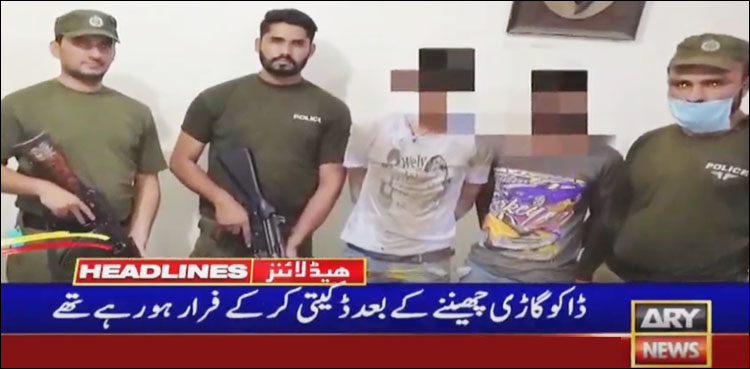 پولیس کے مطابق ڈاکوؤں نے گاڑی چھیننے کے بعد بھٹہ چوک پر دکان پر ڈکیتی کی، اسکواڈ کی جانب سے تعاقب کرنے پر ڈاکوؤں نے فائرنگ کی، ڈولفن و پیرو ٹیموں نے ملزمان کو گھیرے میں لے کر گرفتار کیا۔