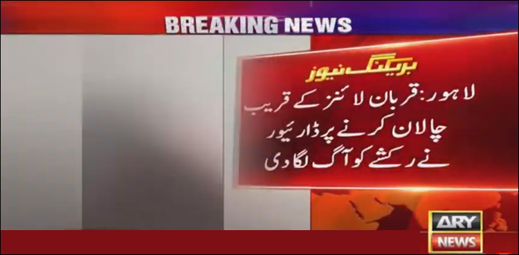 اے آر وائی نیوز کی رپورٹ کے مطابق لاہور کے علاقے قربان لائنز کے قریب پولیس کی جانب سے چالان کرنے پر رکشہ ڈرائیور نے رکشے کو آگ لگادی ، رکشہ ڈرائیور نے چالان وصول کرنے کے بعد پیٹرول چھڑک کر رکشہ کو آگ لگائی۔