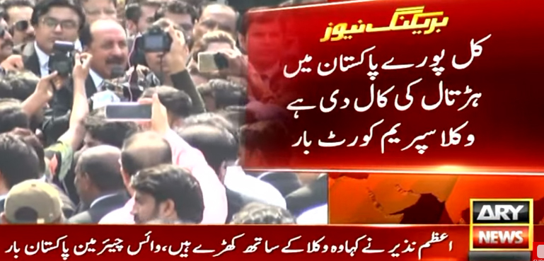 اے آر وائی نیوز کے مطابق لاہور میں سول عدالتوں کی ماڈل ٹاؤن کچہری منتقلی کے خلاف وکلا کے لاہور ہائیکورٹ کے باہر احتجاج کے دوران پولیس لاٹھی چارج اور شیلنگ اور گرفتاریوں کے خلاف سپریم کورٹ بار ایسوسی ایشن نے شدید ردعمل کا اظہار کرتے ہوئے کل دن بھر کی ہٹرال کی کال دے دی ہے۔