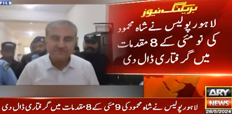 لاہور پولیس نے شاہ محمود قریشی کی نومئی کے 8 مقدمات میں گرفتاری ڈال دی۔