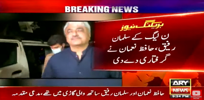 لاہور میں پاک فوج کے افسر پر تشدد کے واقعے میں ن لیگ کے رہنماؤں سلمان رفیق اور حافظ نعمان کو نامزد کر کے گرفتار کر لیا گیا۔