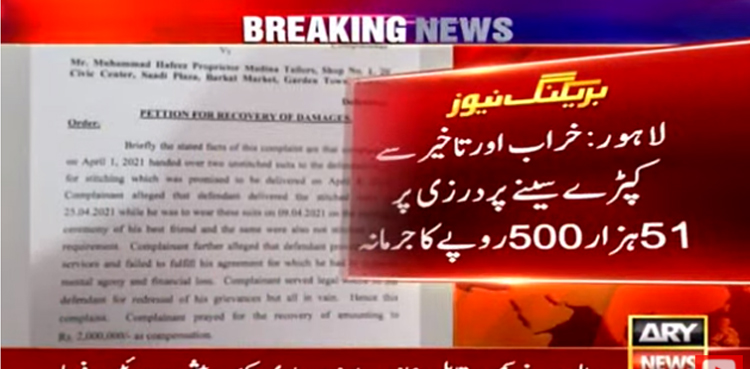 عدالت نے فیصلہ سناتے ہوٸے درزی کو 51 ہزار پانچ سو روپے جرمانہ کر دیا۔