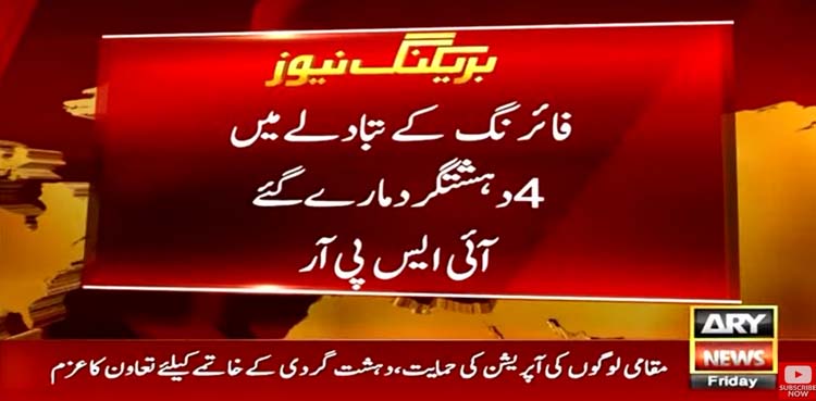 پاک فوج کے شعبہ تعلقات عامہ (آئی ایس پی آر) کے مطابق لکی مروت کے علاقے سمیوواڈا میں انٹیلی جنس بیسڈ آپریشن کے دوران فائرنگ کے تبادلے میں 4 دہشت گرد مارے گئے۔