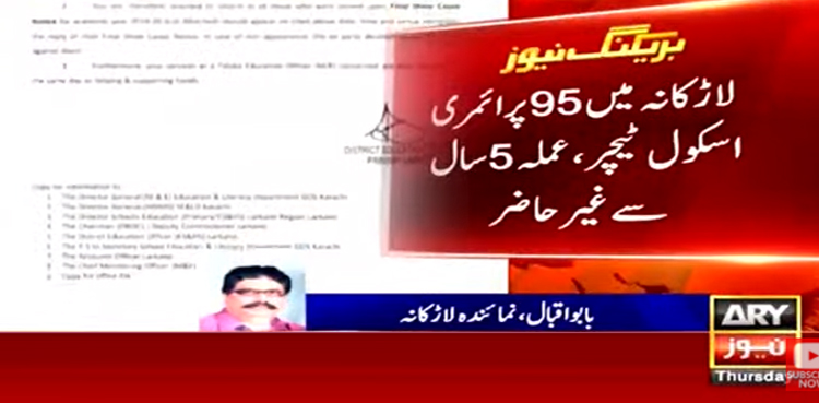 نمائندہ اے آر وائی نیوز بابو اقبال کے مطابق لاڑکانہ ضلع میں پچانوے پرائمری اسکول ٹیچر اور دیگرعملے کی گزشتہ پانچ سال سے گھر بیٹھے تنخواہ لینے کا انکشاف بائیو میٹرک حاضری کے وقت ہوا۔
