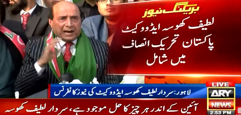 معروف قانون دان سردار لطیف کھوسہ نے پاکستان تحریک انصاف میں شامل ہونے کا اعلان کر دیا ہے۔