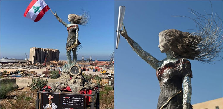 بیروت : لبنانی فنکارہ نے دھماکے میں متاثر ہونے والی عمارتوں کے ملبے سے قومی پرچم تھامے میں لڑکی کا خوبصورت مجسمہ بنادیا۔