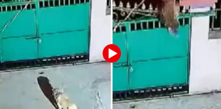 ویڈیو میں دیکھا جاسکتا ہے کہ پالتو کتا گیٹ کے پاس کھڑا کسی چیز پر بھونک رہا ہے چند ہی سیکنڈ میں کتا وہاں سے بھاگ جاتا ہے۔