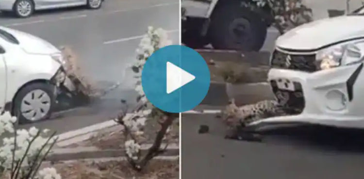 سوشل میڈیا پر ایک ویڈیو تیزی سے وائرل ہورہی ہے جس میں دیکھا جاسکتا ہے کہ ایک تیندوا ہائی وے پر کار کے بونٹ کے نیچے سے نکلنے کے لیے جدوجہد کررہا ہے۔
