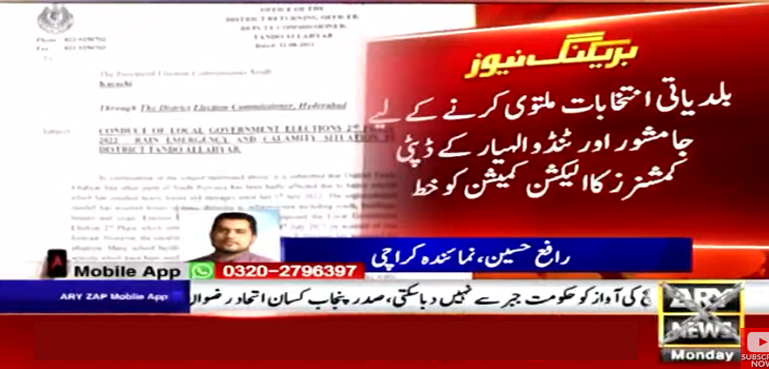 سندھ میں بلدیاتی انتخابات ملتوی کرنے کے لیے جامشورو اور ٹنڈو الہیار کے ڈپٹی کمشنرز نے الیکشن کمیشن کو خطوط ارسال کیے ہیں۔
