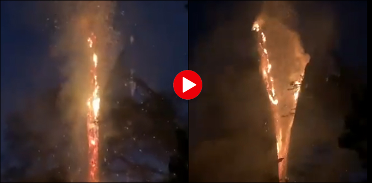 غیرملکی خبررساں ادارے کی رپورٹ کے مطابق صنوبر کے ایک درخت پر آسمانی بجلی آن گری جس کے نتیجے میں درخت میں آگ لگ گئی اور اچانک درخت دوحصوں میں تقسیم ہوگیا۔