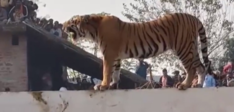 #WATCH | UP: A tiger entered a village in Pilibhit and climbed onto a wall earlier today