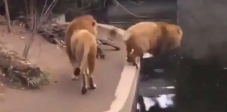 چہل قدمی کے دوران وہ دونوں چلتے ہوئے پنجرے میں موجود ایک مصنوئی تالاب کے کنارے پہنچے ہی تھے کہ ایک شیر بے دھیانی میں تالاب کی جانب اپنا پیر بڑھاتا ہے۔