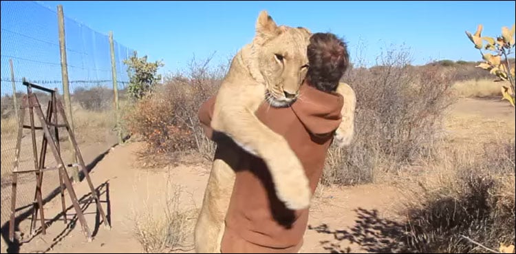سوشل میڈیا پر اکثر ایسی ویڈیوز وائرل ہوتی ہیں جن میں جنگل کے بادشاہ شیر کو اس انسان کے گلے لگتے اور پیار کرتے دیکھا جاسکتا ہو جس نے ان سے محبت کا سلوک کیا ہو۔