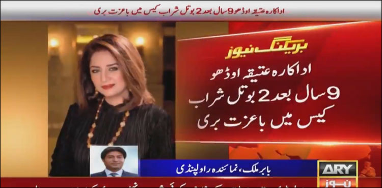 راولپنڈی : اداکارہ عتیقہ اوڈھو کو 9 سال بعد 2 بوتل شراب کیس میں باعزت بری کردیا گیا ، ان پر شراب کی2 بوتلوں کی برآمدگی کا الزام تھا۔