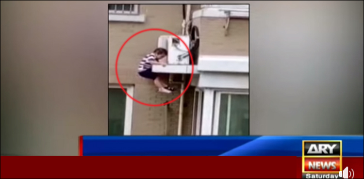 ویڈیو میں دیکھا جاسکتا ہے کہ دو سالہ بچہ فلیٹ کی کھڑکی سے باہر نکل کر چھجے پر آگیا تھا، ایئر کنڈیشن آؤٹر کے قریب بچہ چھجے کو پکڑ کر کھڑا رہا لیکن جب اس کی گرفت کمزور ہوئی تو وہ نیچے جاگرا۔