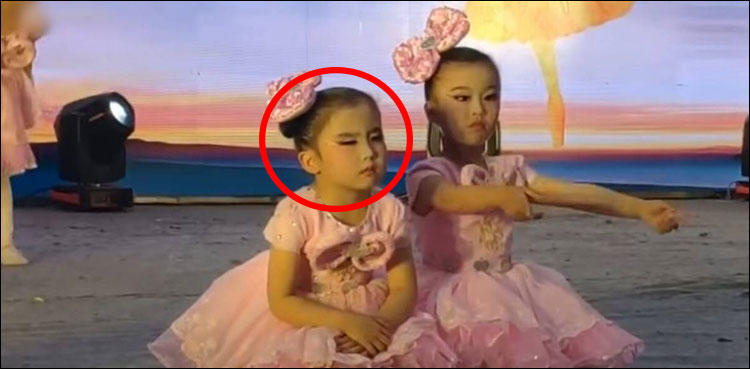 چین کے ایک اسکول میں چھوٹی کلاس کے طلبہ کی ڈانس پرفارمنس چل رہی تھی کہ اس دوران ایک بچی پرفارمنس کے دوران نیند کے مزے لینے لگی۔