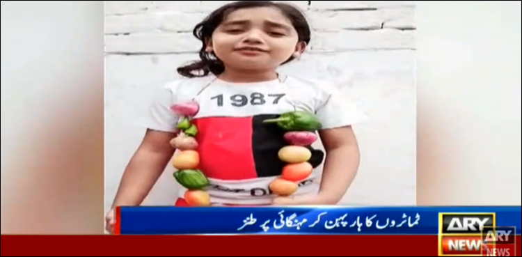 کمسن بچی نے ٹماٹر کا ہار گلے میں پہنا اور کہا کہ کئی دنوں کی خرچی جمع کرکے ٹماٹر خریدنا پڑتے ہیں، ہاتھ جوڑ کر مہنگائی ختم کرنے کا مطالبہ بھی کیا۔