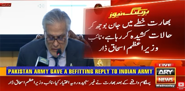 نائب وزیراعظم نے پریس کانفرنس کے آغاز میں کہا کہ آج کی بریفنگ کا مقصدتازہ ترین صورتحال سے آگاہ کرنا ہے پاکستان ہر قسم کی دہشت گردی کی مذمت کرتا ہے پہلگام واقعے کے بعد بھارت نے غیرسنجیدہ رویہ اختیار کیا بھارت کے غیرقانونی اقدامات اور بیانات نےصورتحال کو پیچیدہ کر دیا ہے۔