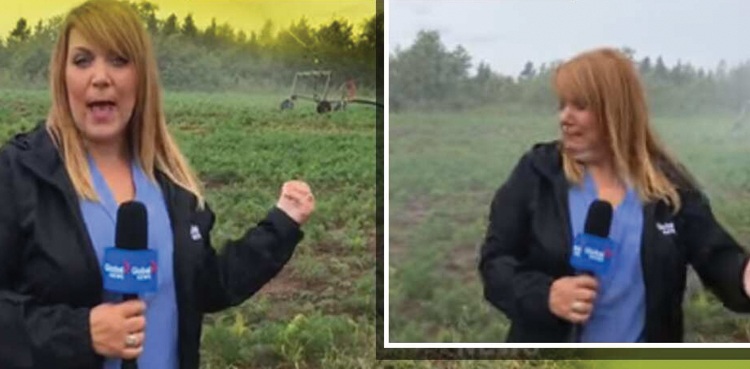 انٹرنیٹ پر شیئر ہونے والی ویڈیو اور رپورٹ کے مطابق گلوبل نیوز چینل کی خاتون رپورٹر ایک کھیت میں کھڑی ہوکر لائیو رپورٹنگ کررہی تھیں کہ اسی دوران اُن پر مشین سے پانی کا چھڑکاؤ کردیا گیا۔