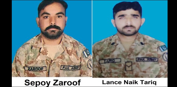 ترجمان کے مطابق فائرنگ کے تبادلے میں پاک فوج کے دو جوانوں نے جام شہادت نوش کیا، شہید ہونے والوں میں لانس نائیک طارق اور سپاہی ضروف شامل ہیں۔