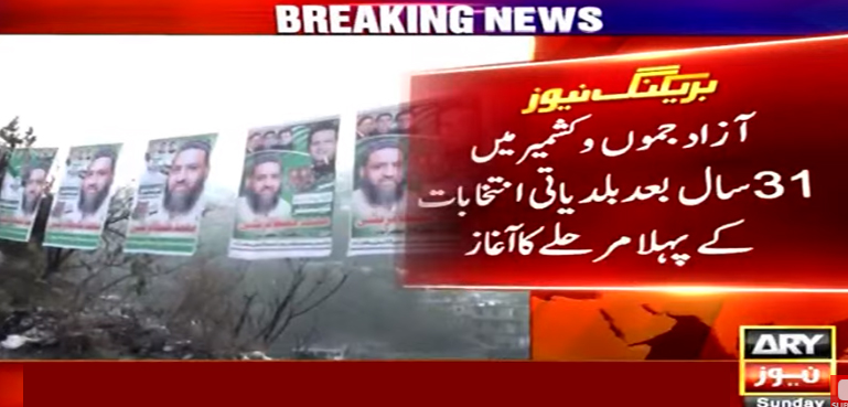 اے آر وائی نیوز کے مطابق آزاد جموں وکشمیر میں 31 سال بعد بلدیاتی انتخابات کے پہلے مرحلے کا آغاز ہوگیا ہے اور مظفر آباد ڈویژن کے تین اضلاع میں پولنگ شروع ہوگئی ہے جو بغیر کسی وقفے کے شام چار بجے تک جاری رہے گی۔