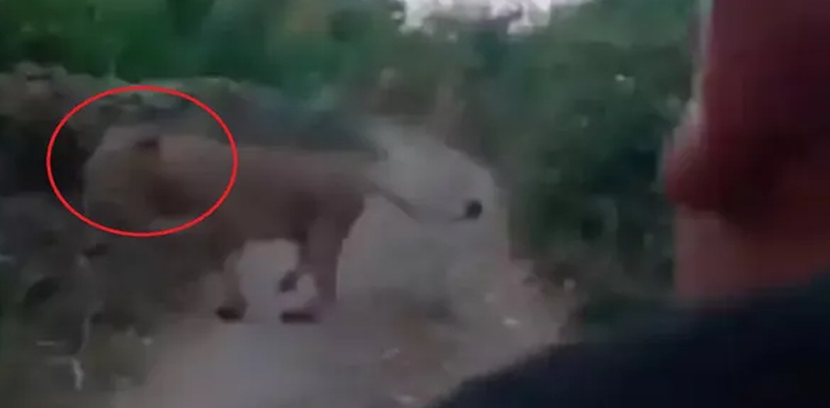 درندے اور انسانوں کے اس آمنے سامنے کے دوران موٹر سائیکل پر سوار شخص صرف چند سیکنڈ کے لیے اس وقت حواس باختہ ہوتا ہے جب شیرنی ان کے انتہائی قریب آجاتی ہے لیکن چند قدم دور شیرنی اچانک سڑک کے بائیں طرف مڑ کر وہاں جمپ لگادیتی ہے اور ان کا راستہ صاف ہوجاتا ہے۔
