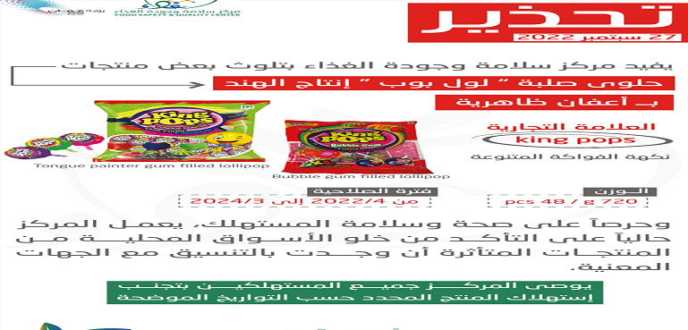 فوڈ سیفٹی اینڈ کوالٹی سینٹر کے جاری کردہ ایک بیان میں کہا گیا ہے کہ بھارت میں میں تیار کی جانے والی کچھ "کنگ پاپ” جن کی معیاد کی مدت بظاہر اپریل 2022 سے مارچ 2024 تک ہے، تاہم اس کے ظاہری سانچوں میں آلودگی پائی گئی ہے۔