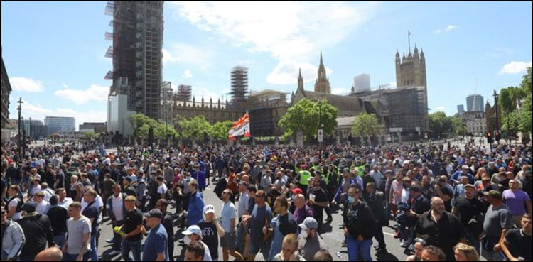 تفصیلات کے مطابق امریکا اور برطانیہ سمیت دنیا بھر میں نسلی تعصب اور پولیس تشدد کے خلاف گزشتہ دو ہفتوں سے مظاہرے جاری ہیں تاہم اب نسل پرست برطانوی شہری بھی میدان میں آگئے۔