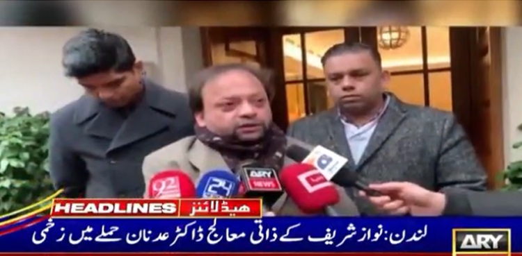 تفصیلات کے مطابق سابق وزیر اعظم میاں محمد نواز شریف کے ذاتی معالج ڈاکٹر عدنان پر برطانوی دالحکومت لندن میں راڈ کے ذریعے حملہ کیا گیا ہے، حملہ نقاب پوش افراد نے اس وقت کیا جب وہ شام کی چہل قدمی کررہے تھے۔