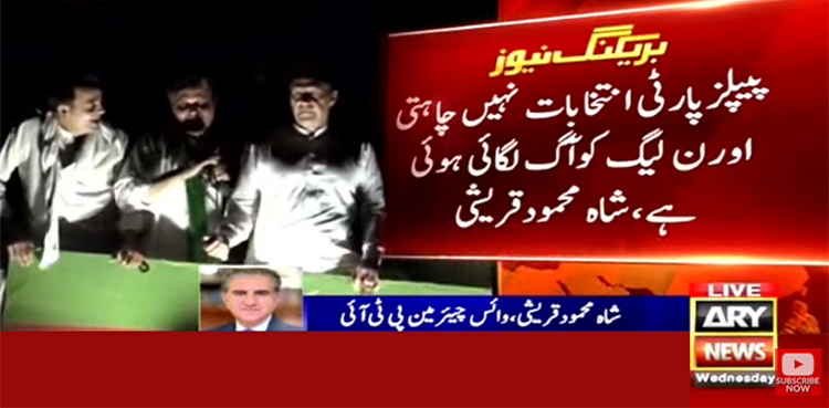 شاہ محمودقریشی نے کہا کہ پیپلزپارٹی انتخابات نہیں چاہتی اور ن لیگ کوآگ لگائی ہوئی ہے ہم تو الیکشن کی تاریخ لینے کیلئے آرہے ہیں ہم تو پوچھنے آرہے ہیں کہ ملک میں انتخابات چاہتےہیں یا نہیں۔