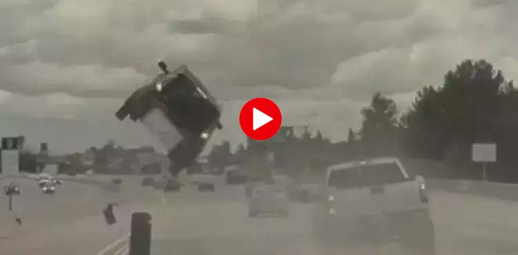 ویڈیو میں دیکھا جاسکتا ہے کہ کار بائیں لین میں چل رہی ہے کہ اچانک پک اپ کا ٹائر نکل کر گاڑی سے ٹکرا جاتا ہے جس کے نتیجے میں گاڑی اڑتی ہوئی دور جاگرتی ہے۔