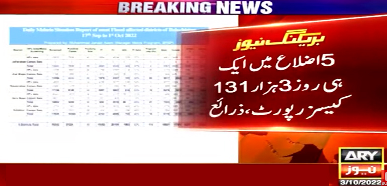 ذرائع کے مطابق گزشتہ 14 روز کے دوران صوبے کے 5 اضلاع میں 37 ہزار 224 ملیریا کیسز سامنے آچکے ہیں اور مثبت کیسز کی شرح 49 فیصد کی انتہائی خطرناک حد تک پہنچ چکی ہے۔