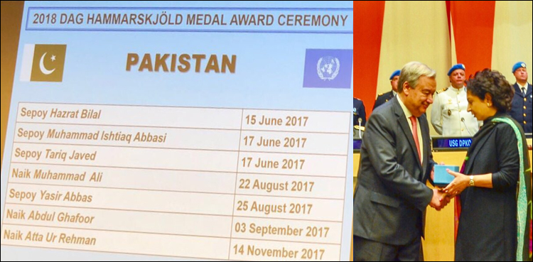 اقوام متحدہ نے امن کے لیے قربانیاں دینےوالے7پاکستانی فوجیوں کو ڈیگ ہیمرشولڈمیڈل دیئے جو یو این میں تعینات پاکستانی مندوب ملیحہ لودھی نے وصول کیے۔