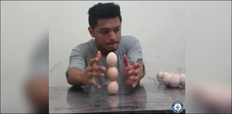 نوجوان نے ایک کے اوپر ایک انڈہ ایسے رکھا کہ دونوں نہیں گرے اور پھر ایبل نے اُس پر تیسرا انڈا بھی رکھا۔